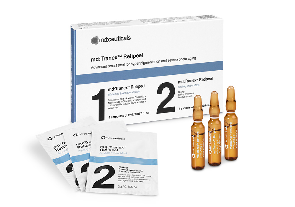 トラネックスレチピールは、トラネキサム酸と、肌のターンオーバーを促進するレチノールを組み合わせたピーリング剤を使用します。この2つの成分の相乗効果により、シミ・くすみ・そばかす・ニキビ跡など、様々な肌トラブルの改善が期待できます。トラネキサム酸は、メラニンの生成を抑え、炎症を鎮める効果があります。